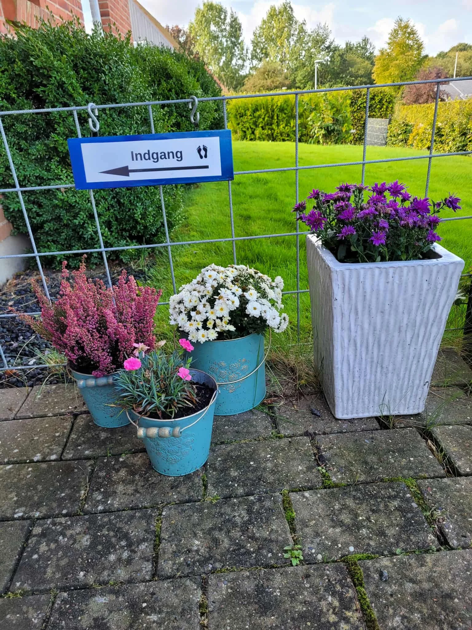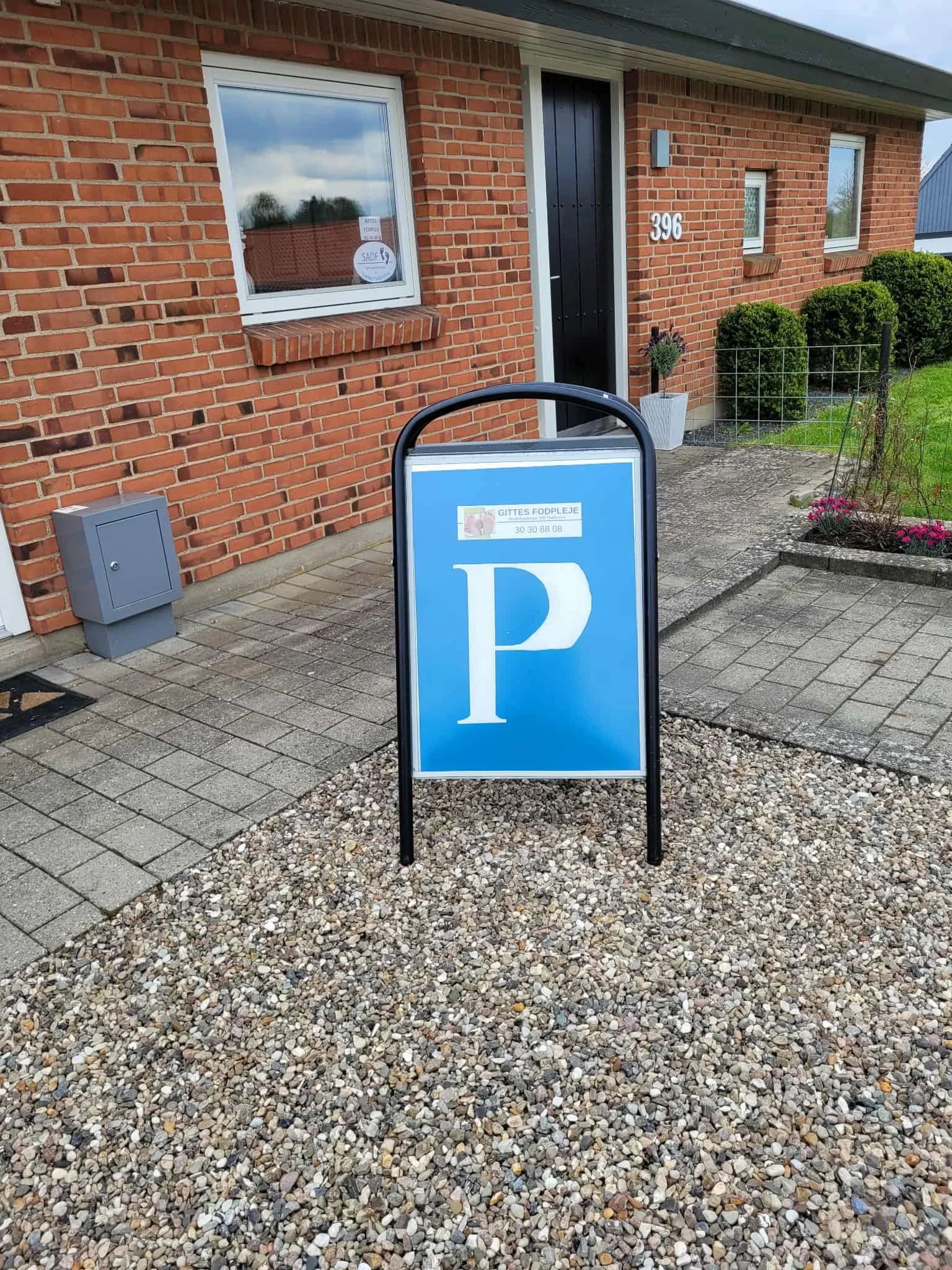 A sign for Gittes Fodpleje, a Danish foot care clinic, displaying contact phone number 30308808, mounted on a brick wall, with the logo of SADF, the Danish Foot Care Professionals association.