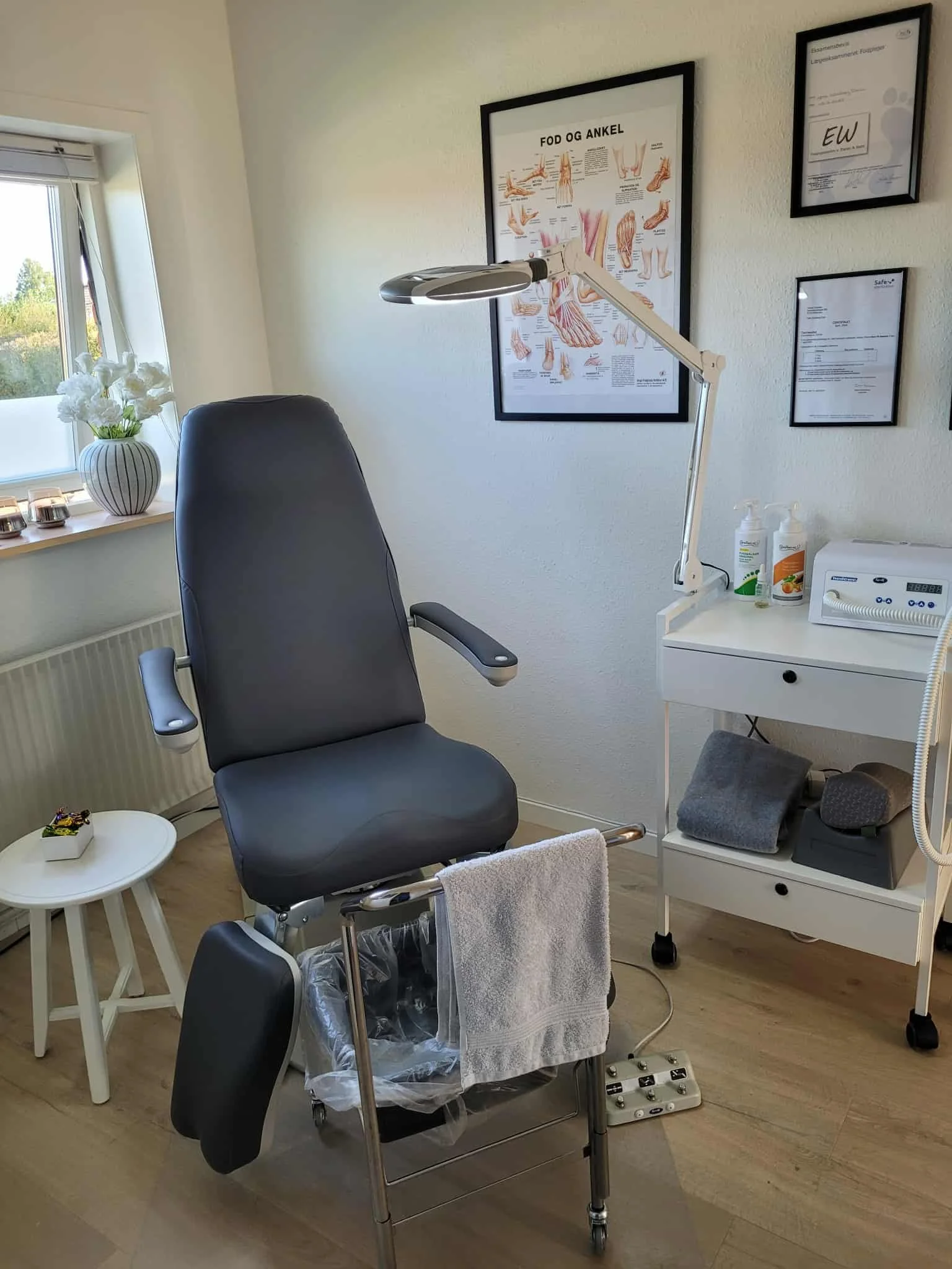 Medical equipment on a small white cart, including a lamp, hand sanitizer bottles, and a medical device with a flexible hose, in a healthcare setting with framed certificates and a medical diagram on the wall.